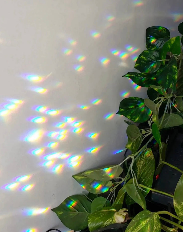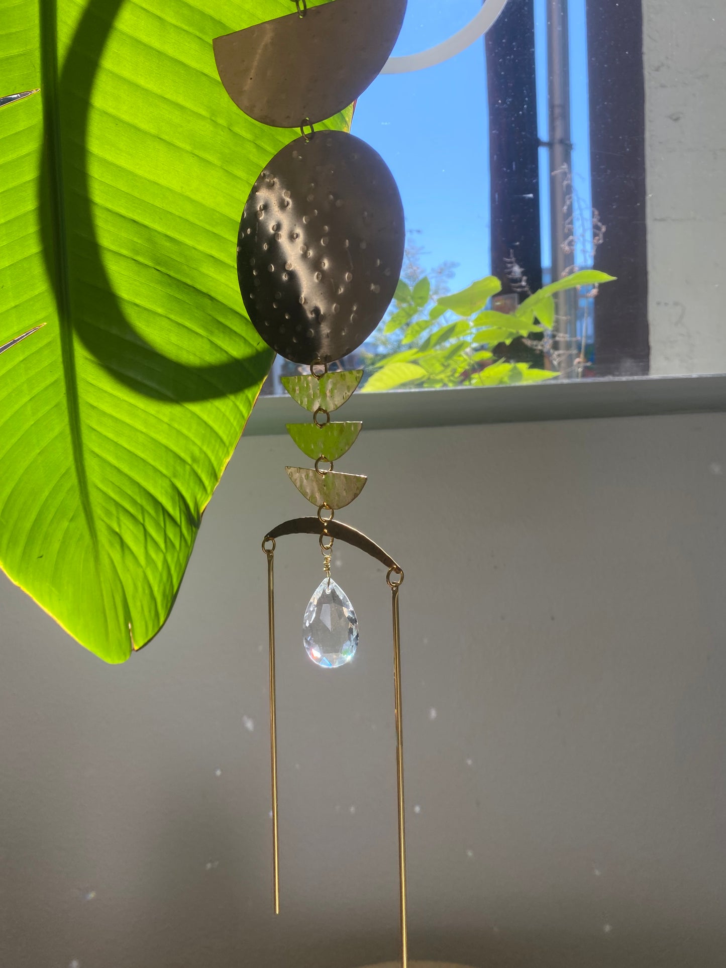 GORGEOUS hand crafted Suncatcher made from hand cut and hammered brass sheet + vintage faceted Crystal. Casts the most beautiful dainty rainbows across your space. Made in the PNW by a Women Owned Business