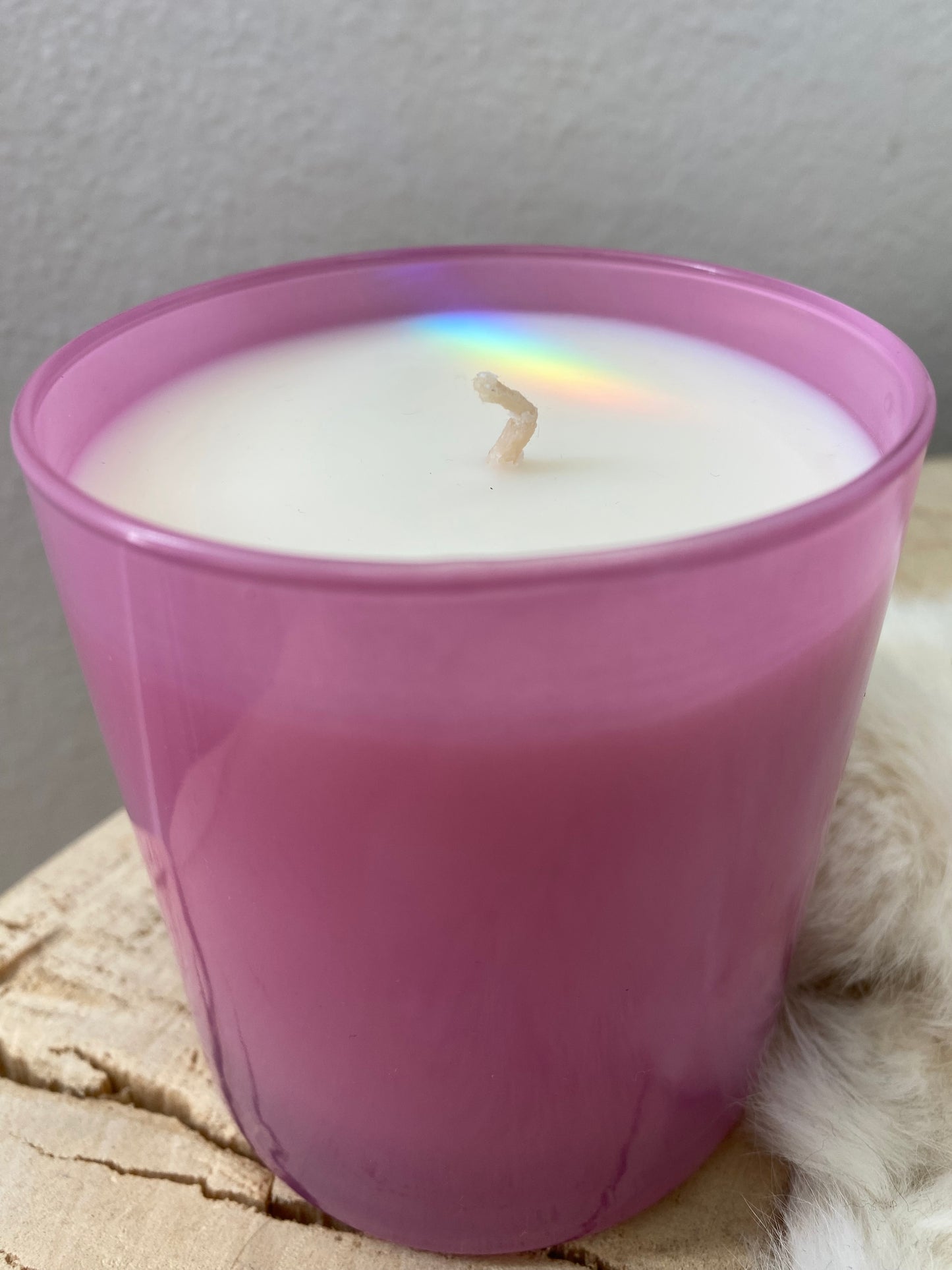 9 oz. soy candle in a colorful translucent fuchsia glass tumbler, packaged in a matching box. Use the vessel after burning through to reuse as a planter, decorative vase or trinket holder!